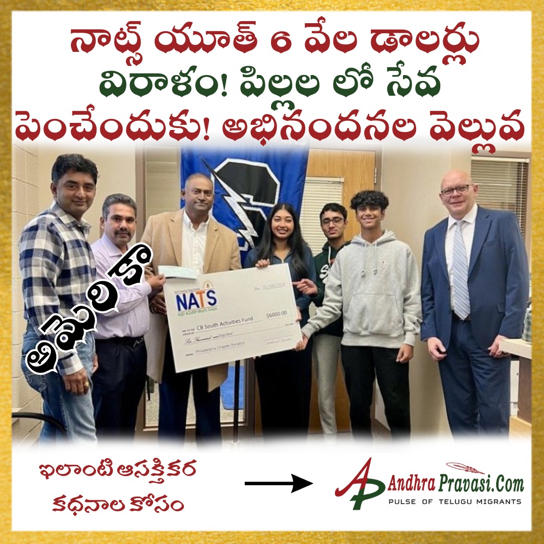 అమెరికా: విద్యార్థుల్లో చిన్ననాటి నుంచే సేవా భావాన్ని పెంచేందుకు ముందుడుగు వేస్తున్న నాట్స్. ఫిలడెల్ఫియాలో నాట్స్ యూత్ కమిటీ నాయకురాలు అమృత శాఖమూరి ఆధ్వర్యంలో ది సిబీ సౌత్ స్కూల్ యాక్టివిటీస్ కోసం విరాళాలు సేకరించారు. నాట్స్ ద్వారా సేకరించిన 6000 డాలర్ల(సుమారు 5 లక్షల రూపాయలు) విరాళాల చెక్కును నాట్స్ అడ్వైజరీ బోర్డు సభ్యులు శ్రీధర్ అప్పసాని, నాట్స్ వైస్ ప్రెసిడెంట్ (ప్రోగ్రామ్స్) హరినాథ్ బుంగటావుల, నాట్స్ బోర్డ్ ఆఫ్ డైరెక్టర్ వెంకట్ లతో కలిసి అమృత శాఖమూరి, సీబీ సౌత్ హైస్కూల్ ప్రిన్సిపాల్ జాసన్ హెచ్. బుచర్ కి అందించారు. నాట్స్ ఇచ్చిన విరాళం సీబీ సౌత్ కు చాలా సహాయ పడతాయి అని జాసన్ అన్నారు. విద్యార్థుల్లో సేవా భావాన్ని పెంచేలా సీబీ సౌత్ కోసం నాట్స్ చేసిన విరాళాల సేకరణను ప్రశంసించారు. ఇలాంటి కార్యక్రమాలు విద్యార్థుల్లో స్ఫూర్తిని నింపుతాయి అని తెలిపారు. నాట్స్ యువ వాలంటీర్లను, ఫిలడెల్ఫియా నాట్స్ విభాగం చేపట్టిన ఈ డోనేషన్ డ్రైవ్ లో పాల్గొని ఈ కార్యక్రమాన్ని విజయవంతం చేసిన ప్రతి ఒక్కరిని నాట్స్ చైర్మన్ ప్రశాంత్ పిన్నమనేని, నాట్స్ ప్రెసిడెంట్ బాపయ్య చౌదరి (బాపు) నూతి ప్రత్యేకంగా అభినందించారు.