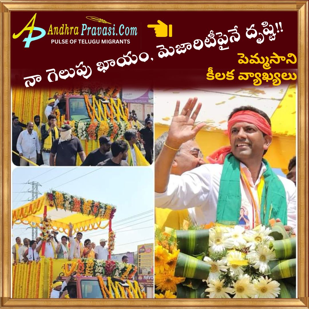 నామినేషన్ కార్యక్రమానికి హాజరైన అభిమానులకు కృతజ్ఞతలు - ఇదే స్ఫూర్తిని పోలింగ్ రోజూ కొనసాగించాలి - రాష్ట్రానికి జరిగిన అన్యాయానికి ప్రజలు బదులు చెప్పాలి - నా గెలుపు ఖాయం, మెజారిటీపైనే దృష్టి - గుంటూరు జిల్లా ప్రజలకు సేవ చేస్తూనే ఉంటా అని పెమ్మసాని చంద్రశేఖర్ తెలిపారు.