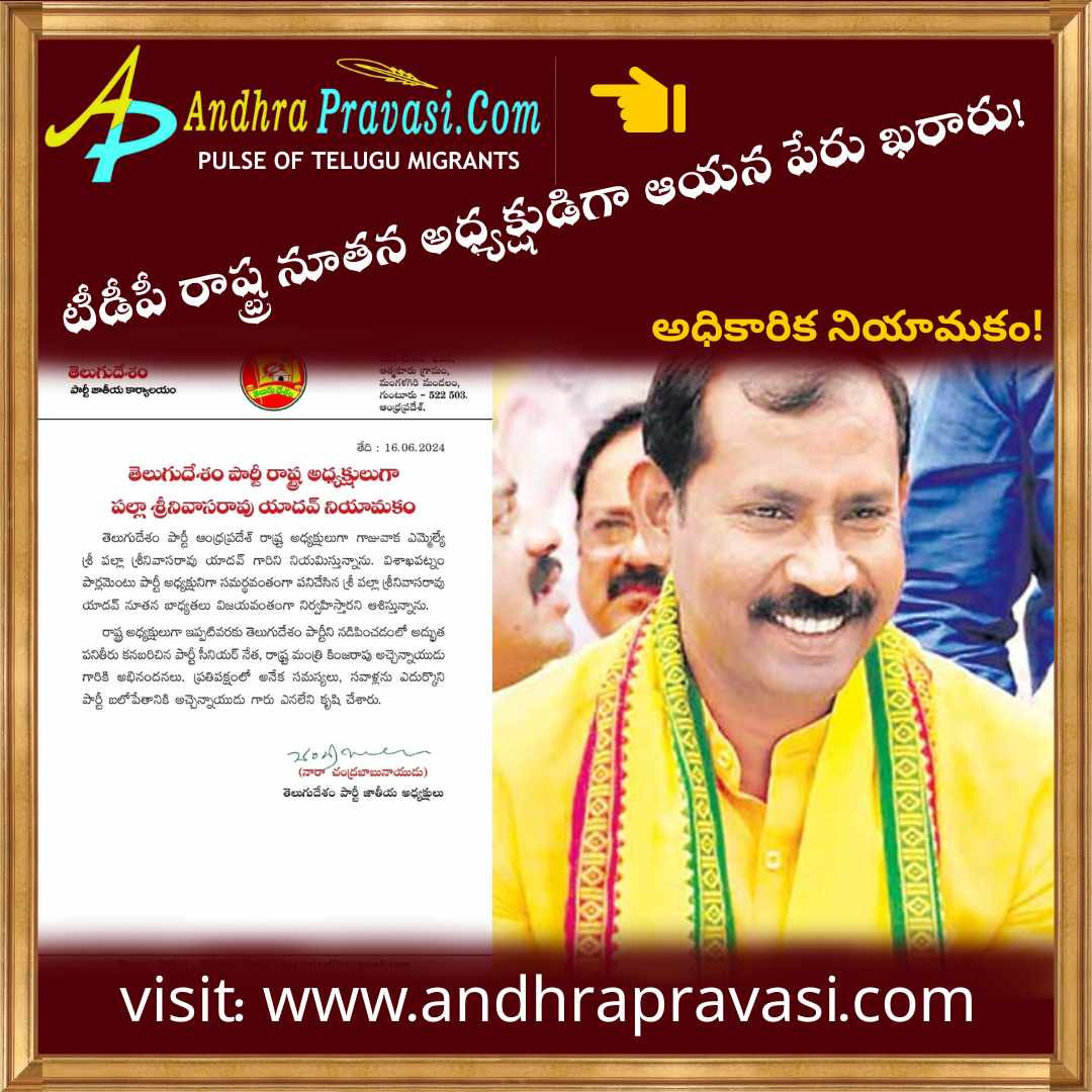 టీడీపీ రాష్ట్ర నూతన అధ్యక్షుడిగా పల్లా శ్రీనివాస్ రావు పేరు ఖరారు అయ్యింది. తెలుగుదేశం పార్టీ రాష్ట్ర నూతన అధ్యక్షులుగా యాదవ సామాజికవర్గానికి చెందిన పల్లా శ్రీనివాసరావు నియామకం జరిగింది. అచ్చెన్నాయుడు స్థానంలో టీడీపీ ఏపీ అధ్యక్షుడుగా పల్లా శ్రీనివాస్ ను నియమించడం జరిగింది. బీసీ యాదవ వర్గానికి చెందిన పల్లా శ్రీనివాస్ వైపు సీఎం చంద్రబాబు మొగ్గు చూపారు. గాజువాక ఎమ్మెల్యేగా రాష్ట్రంలోనే అత్యధిక మెజార్టీతో ఎన్నికైన పల్లా శ్రీనివాస్కు ఆ స్థానం కేటాయించారు. 95,235 ఓట్లతో టీడీపీ నుంచి గాజువాక ఎమ్మెల్యేగా ఆయన గెలుపొందారు.