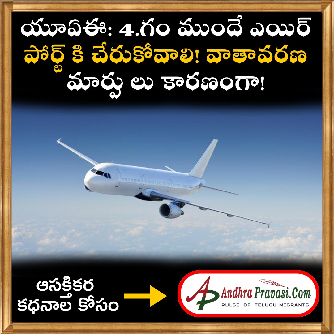 యూఏఈ: అస్థిర వాతావరణం కారణంగా సోమవారం మరియు మంగళవారాల్లో దేశం నుండి బయలుదేరే ప్రయాణీకులు ముందుగానే విమానాశ్రయానికి చేరుకోవాలని సూచించినట్లు యూఏఈ విమానయాన సంస్థలు ఆదివారం తెలిపాయి. అయితే, ఎమిరేట్స్, ఎతిహాద్ మరియు ఫ్లై దుబాయ్ అన్ని విమానాలు షెడ్యూల్ ప్రకారం పనిచేస్తాయని, ప్రతికూల వాతావరణం వల్ల ప్రభావితం కాలేదని పేర్కొన్నాయి. “ఫిబ్రవరి 11 మరియు 12 తేదీల్లో దుబాయ్ లో భారీ ఉరుములతో కూడిన వర్షం కురుస్తుందని అంచనా వేసినందున, దుబాయ్ అంతర్జాతీయ విమానాశ్రయానికి వచ్చే ప్రయాణికులకు ట్రాఫిక్ సమస్యలు తలెత్తి ఆలస్యం అయ్యే అవకాశం ఉంది. అందుకే విమానాశ్రయానికి ముందుగానే చేరుకునేలా ప్లాన్ చేసుకోవాలి. ముందుగానే విమానాశ్రయానికి వచ్చి చెక్- ఇన్ ఫార్మాలిటీలను పూర్తి చేసుకోవాలి. ”అని ఎమిరేట్స్ ప్రతినిధి వెల్లడించారు. షెడ్యూల్ ప్రకారం విమానం బయలుదేరే సమయానికి నాలుగు గంటల ముందు ఎయిర్ పోర్ట్ కు చేరుకోవాలని, దుబాయ్ ఆధారిత క్యారియర్ ఫ్లై దుబాయ్ సూచించింది.