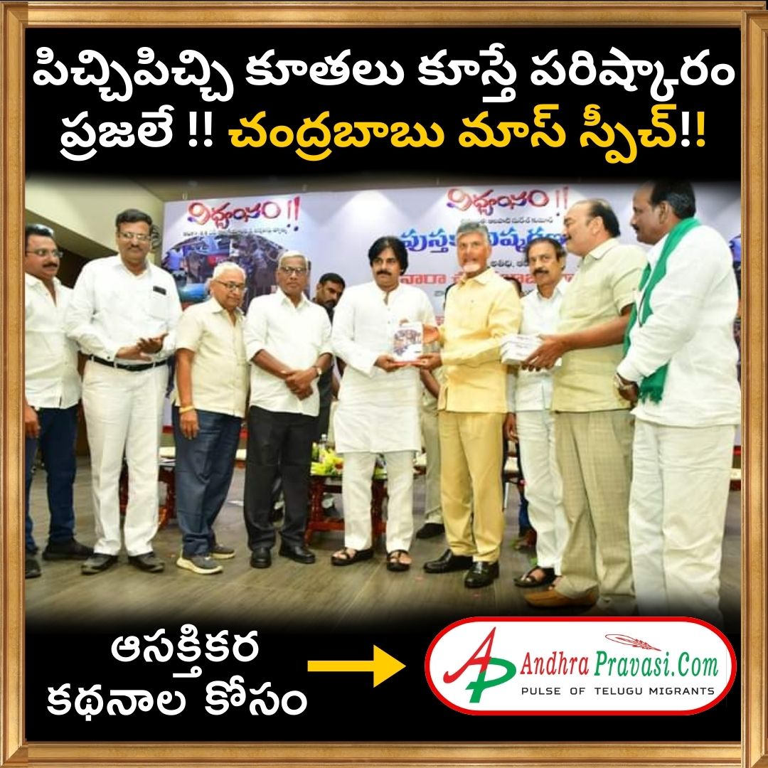 అమరావతి :- సీఎం జగన్ ది ఐదేళ్ల విధ్వంస పాలన అని, విధ్వంసం పుస్తకం ఒక జర్నలిస్ట్ ధర్మాగ్రహం అని టీడీపీ అధినేత చంద్రబాబు నాయుడు అన్నారు. ప్రజలతో సైకో అని పిలిపించుకునే ఏకైక ముఖ్యమంత్రి జగనే అని ఎద్దేవా చేశారు. బానిసలుగా ఉంటారో...తిరుగబడతారో ఆలోచించాలని పిలపునిచ్చారు.