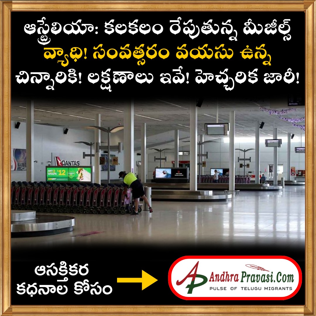 ఇటీవల మీజిల్స్ వ్యాధి ఆస్ట్రేలియాలో కలకలం రేపుతుంది. విదేశాల నుంచి వచ్చిన ఏడాది వయసు ఉన్న చిన్నారికి ఈ వ్యాధి సోకింది. దీనితో సౌత్ ఆస్ట్రేలియా మరియు విక్టోరియన్ ఆరోగ్య అధికారులు హెచ్చరికను జారీ చేశారు. ప్రజలను అప్రమత్తంగా ఉండాలని సూచిస్తున్నారు. ఈ వ్యాధి లక్షణాలు జ్వరం దగ్గు ముక్కు కారటం మరియు కళ్ళ నొప్పులు తో మొదలవుతాయి. తర్వాత శరీరంపై మచ్చలు దద్దుర్లు వ్యాపిస్తాయి. ఒకవేళ ఈ లక్షణాలు గనుక ఉంటే వెంటనే డాక్టర్ను సంప్రదించాలని తగిన జాగ్రత్తలు తీసుకోవాలని అధికారులు హెచ్చరించారు.