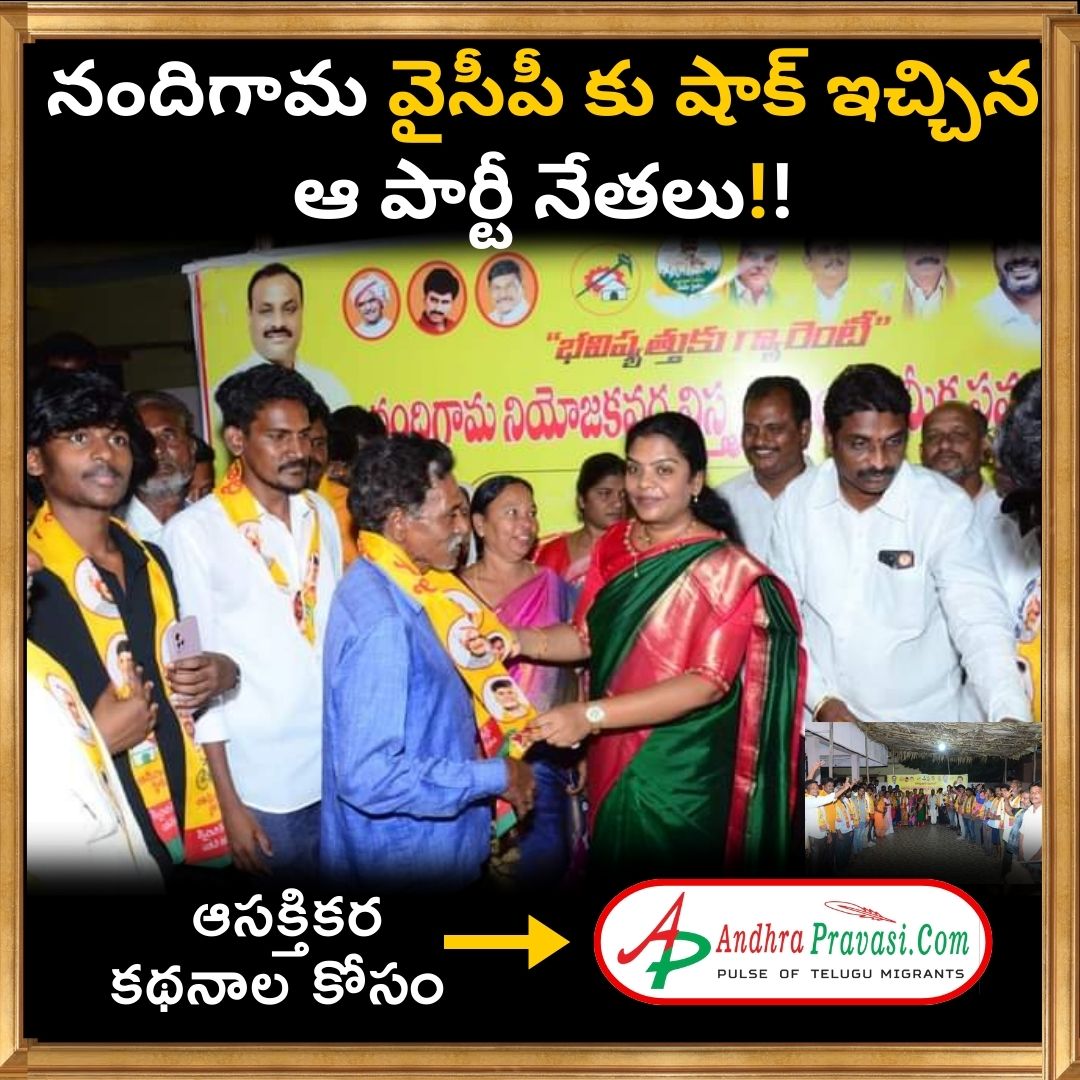 నందిగామ : నందిగామ పట్టణం కాకాని నగర్ నందు శుక్రవారం నాడు నందిగామ పట్టణం 9 వ వార్డు ముక్కపాటి కాలనీ నుంచి వైస్సార్ పార్టీని వీడి తెలుగుదేశం పార్టీలోకి విచ్చేసిన 40 కుటుంబాల వైస్సార్ పార్టీ నేతలు, కార్యకర్తలను పట్టణ తెదేపా కౌన్సిలర్లు,తెదేపా నేతల బృందంతో కలిసి పార్టీ కండువా కప్పి తెలుగుదేశం పార్టీలోకి సాదరంగా ఆహ్వానించిన మాజీ శాసనసభ్యురాలు శ్రీమతి తంగిరాల సౌమ్య