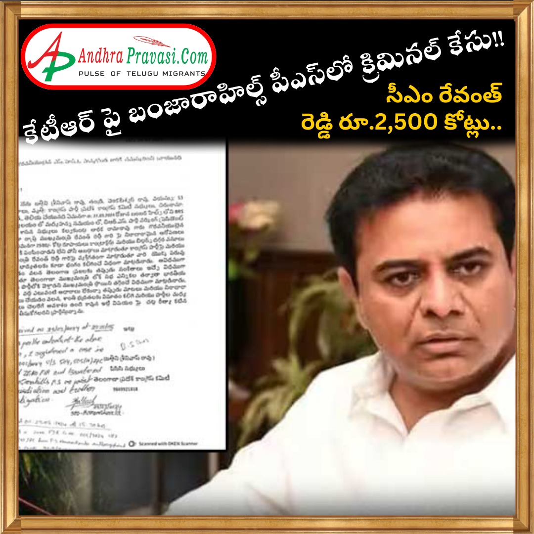 కేటీఆర్‍ పై బంజారాహిల్స్ పీఎస్‍లో క్రిమినల్ కేసు!! సీఎం రేవంత్ రెడ్డి రూ.2,500 కోట్లు..