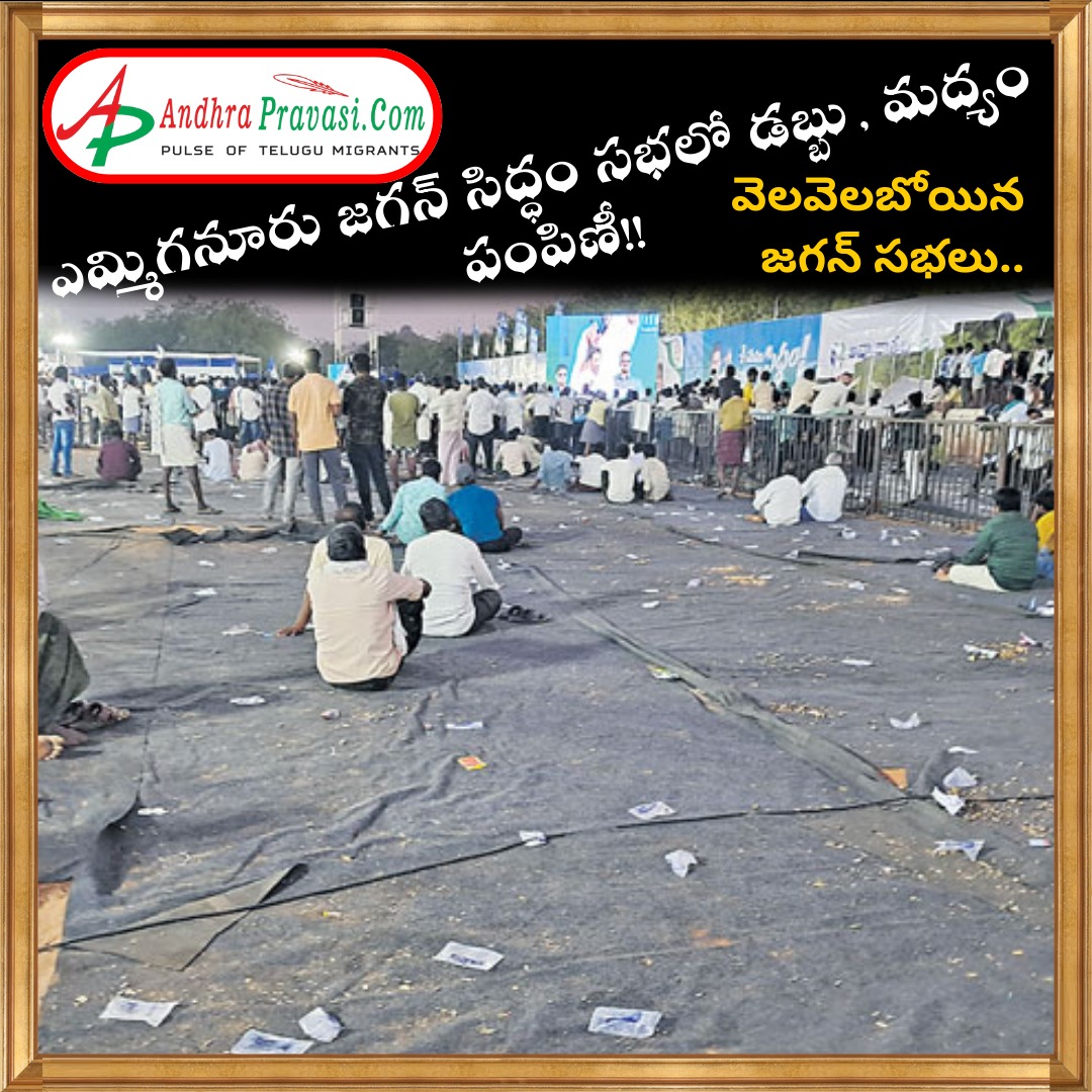 - వీవర్స్ కాలనీ గ్రౌండ్ దగ్గర మహిళలకు డబ్బు పంపిణీ - పురుషులకు మందు, బిర్యానీ ప్యాకెట్లు అందజేత - అన్ని చేసి తరలించినా సభలో ఉండని ప్రజలు - వెలవెలబోయిన జగన్ సభలు