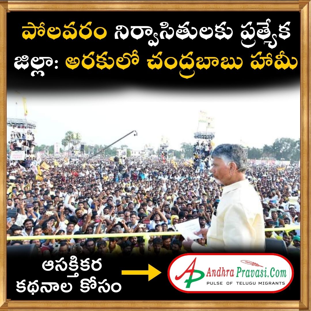 పోలవరం నిర్వాసితులకు ప్రత్యేక జిల్లా ఉండాలని టీడీపీ ప్రభుత్వం ఏర్పడగానే ప్రత్యేక జిల్లాను ప్రకటిస్తామని టీడీపీ అధినేత చంద్రబాబు హామీ ఇచ్చారు. అరకులో రా కదలిరా బహిరంగసభలో మాట్లాడారు. పోలవరం ప్రాంతం ఏలూరు జిల్లా పరిధిలో ఉండగా, మరో గిరిజన ప్రాంతమైన రంపచోడవరం నియోజకవర్గం అల్లూరి సీతారామరాజు జిల్లాలో ఉంది.