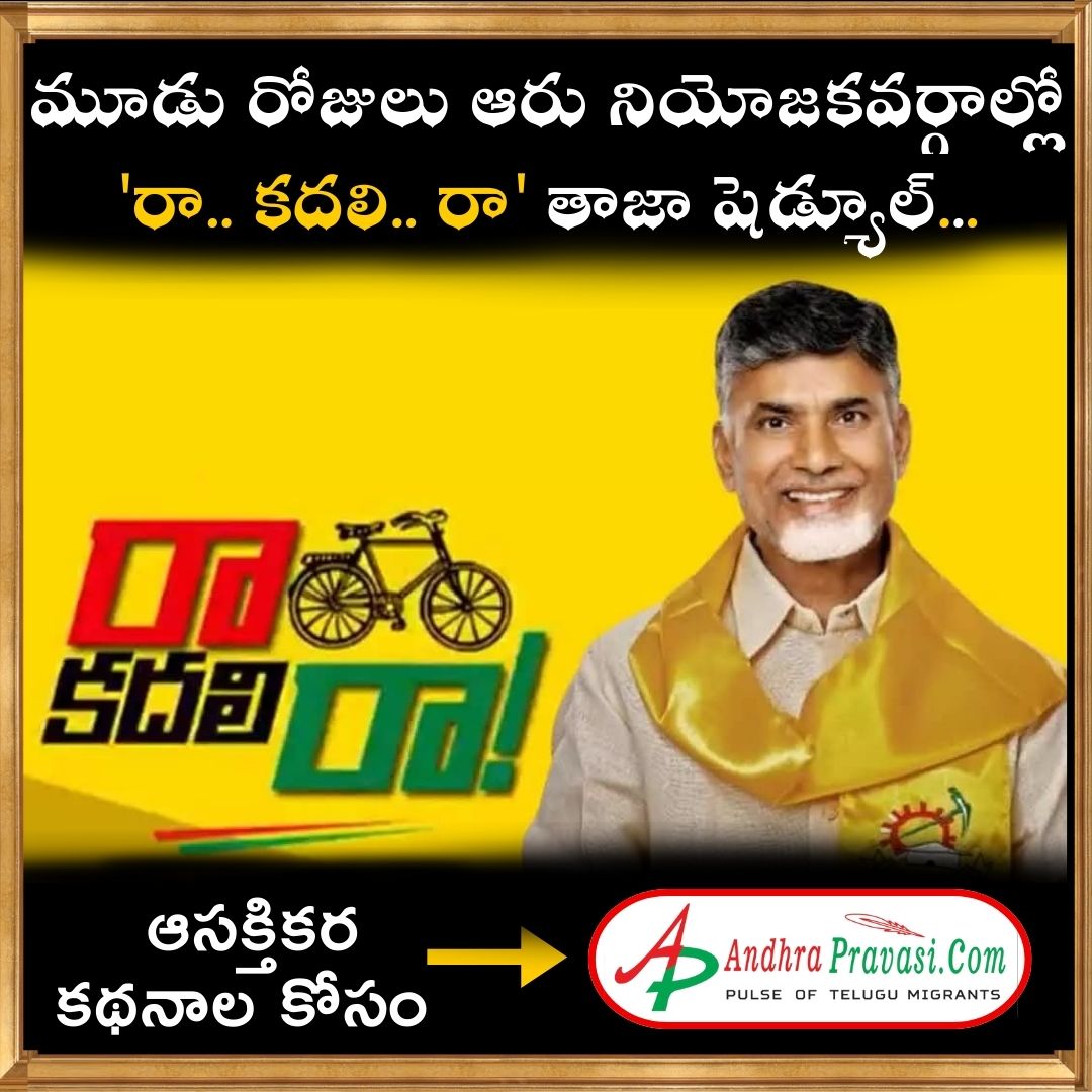 టీడీపీ అధినేత నారా చంద్రబాబు నాయుడు 'రా.. కదలి.. రా' కార్యక్రమానికి సంబంధించి తాజా షెడ్యూల్ను బుధవారం టీడీపీ విడుదల చేసింది. అందులో భాగంగా ఈ నెల 27 నుంచి వరుసగా మూడు రోజుల పాటు ఆరు నియోజకవర్గాల్లో 'రా.. కదలి.. రా' బహిరంగ సభలు నిర్వహించనున్నారు.