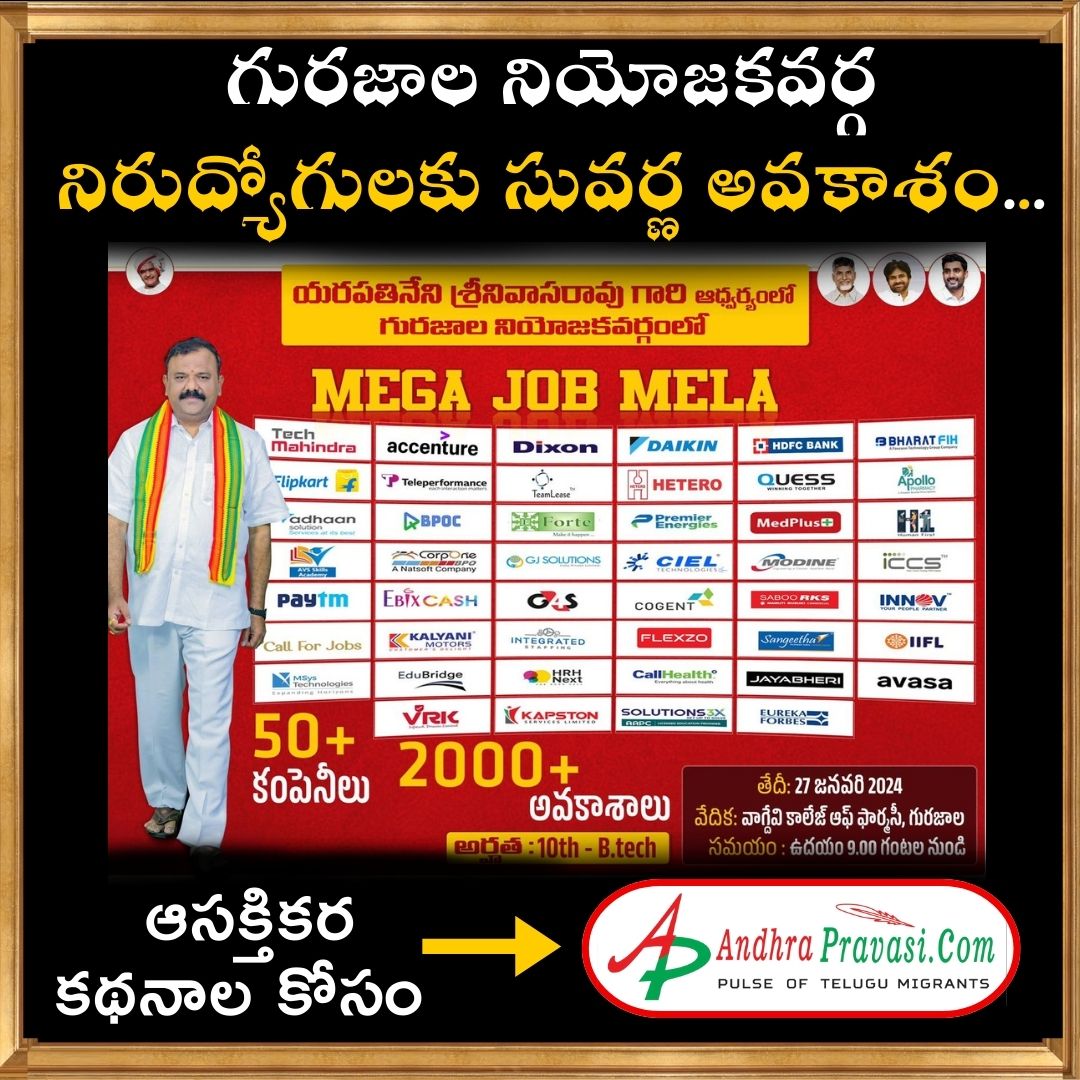 గురజాల మాజీ శాసనసభ్యులు శ్రీ యరపతినేని శ్రీనివాసరావు నియోజకవర్గంలోని నిరుద్యోగులకు ఉపాధి కల్పించేందుకు 50+ కంపెనీలతో మెగా జాబ్ మేళా ను నిర్వహిస్తున్నారు.