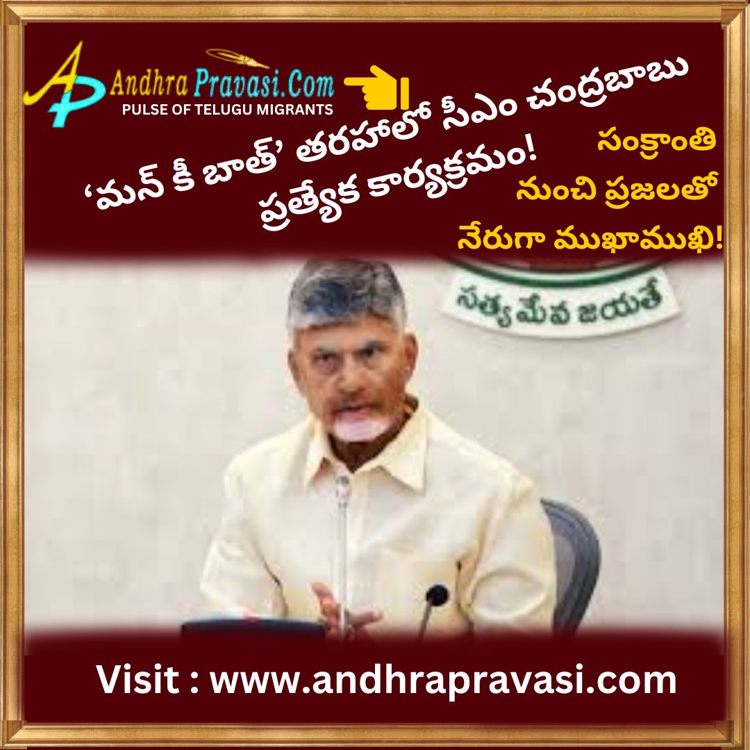 ప్రధాని మోదీ నిర్వహిస్తున్న మన్ కీ బాత్ తరహాలోనే.. రాష్ట్రంలో ముఖ్యమంత్రి చంద్రబాబు కూడా ప్రజలతో నేరుగా మాట్లాడనున్నారు. సంక్రాంతి నుంచి ఈ కార్యక్రమం ప్రారంభమయ్యే అవకాశం ఉంది. ప్రస్తుతం దీనిపై చర్చలు జరుగుతున్నాయి. ఆయన హయాంలోనే 1995-2004 మధ్య 'డయల్ యువర్ సీఎం' నిర్వహించారు. ఇప్పుడు మన్ కీ బాత్, డయల్ యువర్ సీఎం కార్యక్రమాల కలయిక ద్వారా ప్రజలతో మమేకం అయ్యేందుకు ఆయన సిద్ధమవుతున్నారు. త్వరలోనే ప్రజలతో ముఖాముఖి సమావేశాలు నిర్వహించనున్నట్లు బుధవారం అసెంబ్లీ వేదికగా చంద్రబాబు ప్రకటించారు. ఇందుకు అనుగుణంగా ఏర్పాట్లు జరుగుతున్నాయి. ఆడియో/ వీడియో విధానంలో దీన్ని నిర్వహించే అవకాశం ఉంది. ఈ నెల 27న పోలవరానికి చంద్రబాబు?