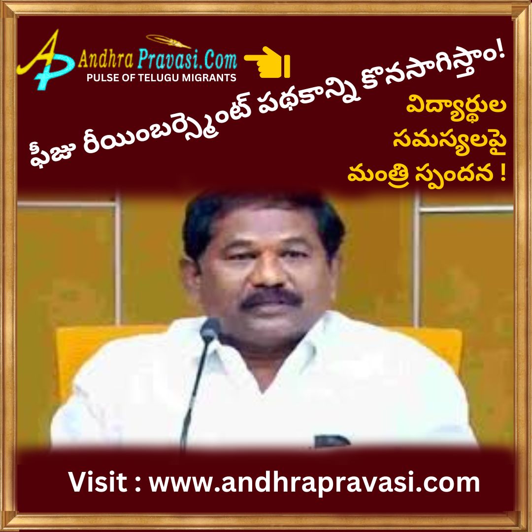 విద్యార్థుల కోసం ఫీజు రీయింబర్స్మెంట్ పథకాన్ని కూటమి ప్రభుత్వం కొనసాగిస్తుందని సాంఘిక సంక్షేమ శాఖ మంత్రి డోలా బాలవీరాంజనేయస్వామి స్పష్టం చేశారు. ఇకపై కళాశాల యాజమాన్యాల ఖాతాలకే ఫీజు రీయింబర్స్మెంట్ చెల్లింపులు చేస్తామని తెలిపారు. ఫీజు రీయింబర్స్మెంట్ పథకం అమలుపై శాసనమండలి సభ్యుల ప్రశ్నలకు మంత్రి సమాధానం ఇచ్చారు. గత ప్రభుత్వం 'తల్లి ఖాతా'లో నగదు జమచేసే విధానం తెచ్చి ఫీజులు చెల్లించకుండా ఎగ్గొట్టిందని ఆరోపించారు. తల్లి ఖాతాలో, ఆ తర్వాత తల్లి-విద్యార్థి జాయింట్ ఖాతాలో నగదు జమ చేయడం వల్ల అవస్థలు పడ్డారని చెప్పారు. ఇకపై ఈ విధానానికి స్వస్తి పలికి గతంలో మాదిరిగా.. విడతల వారీగా విద్యార్థుల ఫీజుల బకాయిలు కళాశాలలకు చెల్లిస్తామన్నారు. పీజీ చదివే విద్యార్థులకు ఫీజు రీయింబర్స్మెంట్ ఇచ్చే అంశం ప్రభుత్వ పరిశీలనలో ఉందన్నారు. గత ప్రభుత్వం మెస్ ఛార్జీలు, ట్యూషన్ ఫీజులు సగం కూడా చెల్లించలేదన్నారు. విద్యార్థులకు న్యాయం జరిగేలా చర్యలు తీసుకుంటామన్నారు.
