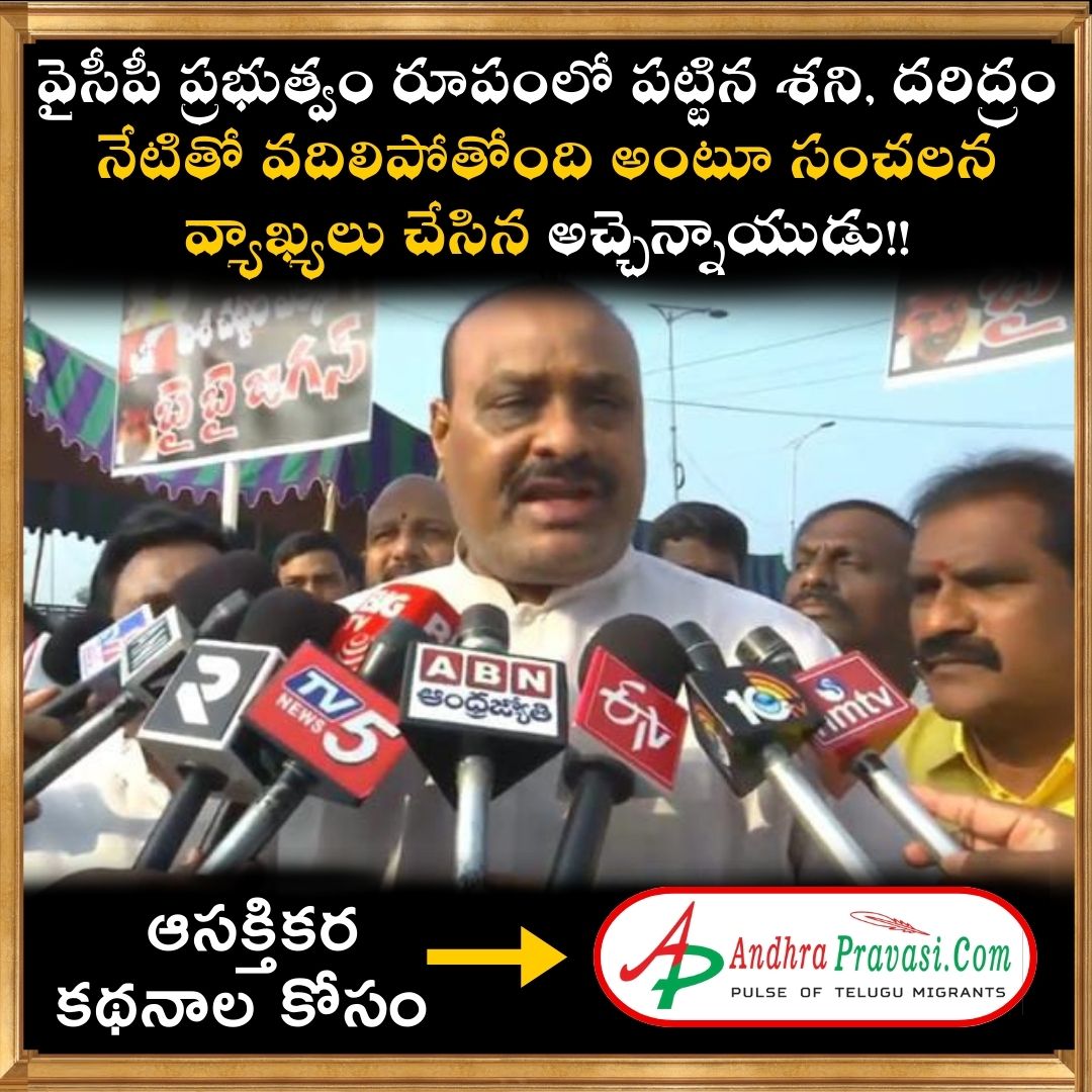 ఐదేళ్ల ప్రజావ్యతిరేక విధానాలపై రూపొందించిన పుస్తకాన్ని దహనం చేస్తాం. కౌరవ సభను మళ్లీ గౌరవ సభగా మారుస్తాం. వైసీపీ ఫేక్ పోస్టులను ఊరికే వదిలిపెట్టం... బీజేపీ కాళ్లపై పడటం, కాళ్లు మొక్కటం వైసీపీ సంస్కృతే, అనేక కేసుల్లో ఏ1 ముద్దాయిగా జగనే వీటికి పాకులాడతారు... చంద్రబాబు ఏ నిర్ణయం తీసుకున్నా రాష్ట్ర ప్రయోజనాల కోసమే అని తెలిపిన టీడీపీ రాష్ట్ర అధ్యక్షుడు అచ్చెన్నాయుడు.