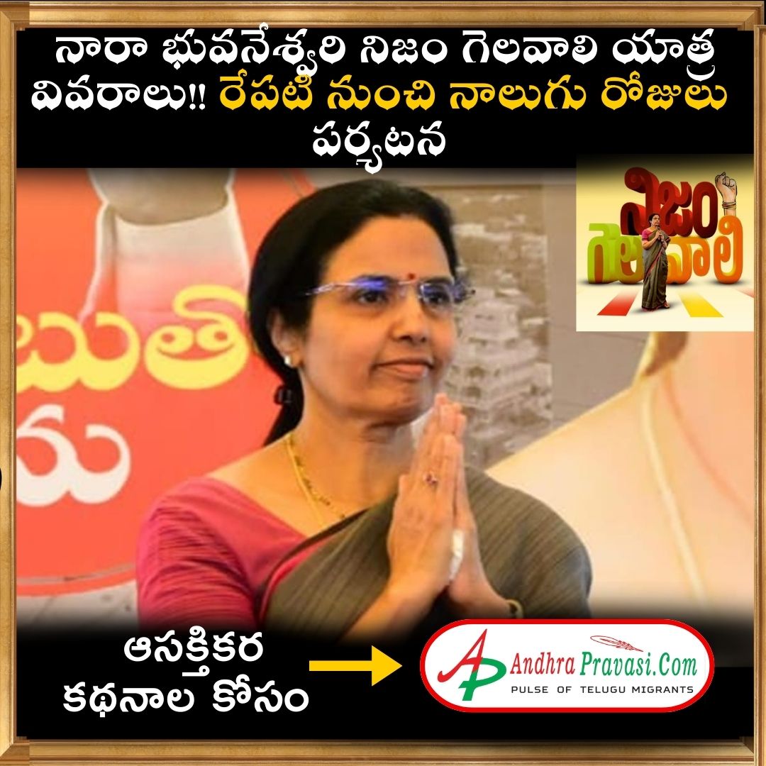 రేపటి నుంచి నారా భువనేశ్వరి నిజం గెలవాలి యాత్ర - రేపటి నుంచి నాలుగు రోజుల పాటు భువనేశ్వరి పర్యటన... రేపు పోలవరం, చింతలపూడిలో భువనేశ్వరి పర్యటన... 27న తాడేపల్లిగూడెం, ఉంగుటూరు, గన్నవరంలో పర్యటన... 28న నూజివీడు, పెనమలూరు, గుడివాడలో పర్యటన... 29న మచిలీపట్నం, అవనిగడ్డలో భువనేశ్వరి పర్యటన... చంద్రబాబు అక్రమ అరెస్టుతో మనస్తాపానికి గురై మృతిచెందిన కుటుంబాలను పరామర్శించనున్న నారా భువనేశ్వరి