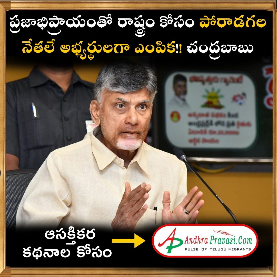 రాష్ట్ర ప్రయోజనాలే ఏకైక ఎజెండాగా ఎన్డీయేలో చేరాం... లోక్సభలో బలమైన గళం వినిపిస్తూ రాష్ట్రం కోసం పోరాడగల నేతలనే అభ్యర్థులుగా నిలబెడుతున్నాం... లోక్సభకు 13 మంది టీడీపీ అభ్యర్థులు, 11 అసెంబ్లీ సీట్లకు కూడా అభ్యర్థులను ప్రజాభిప్రాయంతో ఎంపిక అని టీడీపీ అధినేత చంద్రబాబు తెలిపారు.